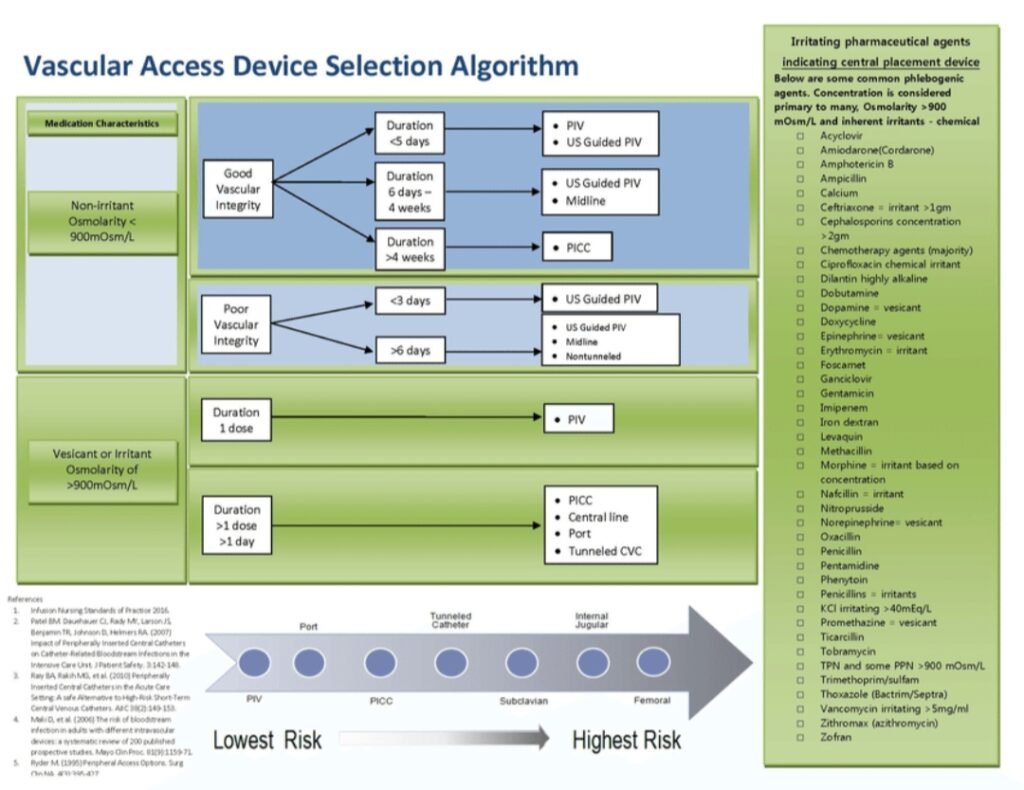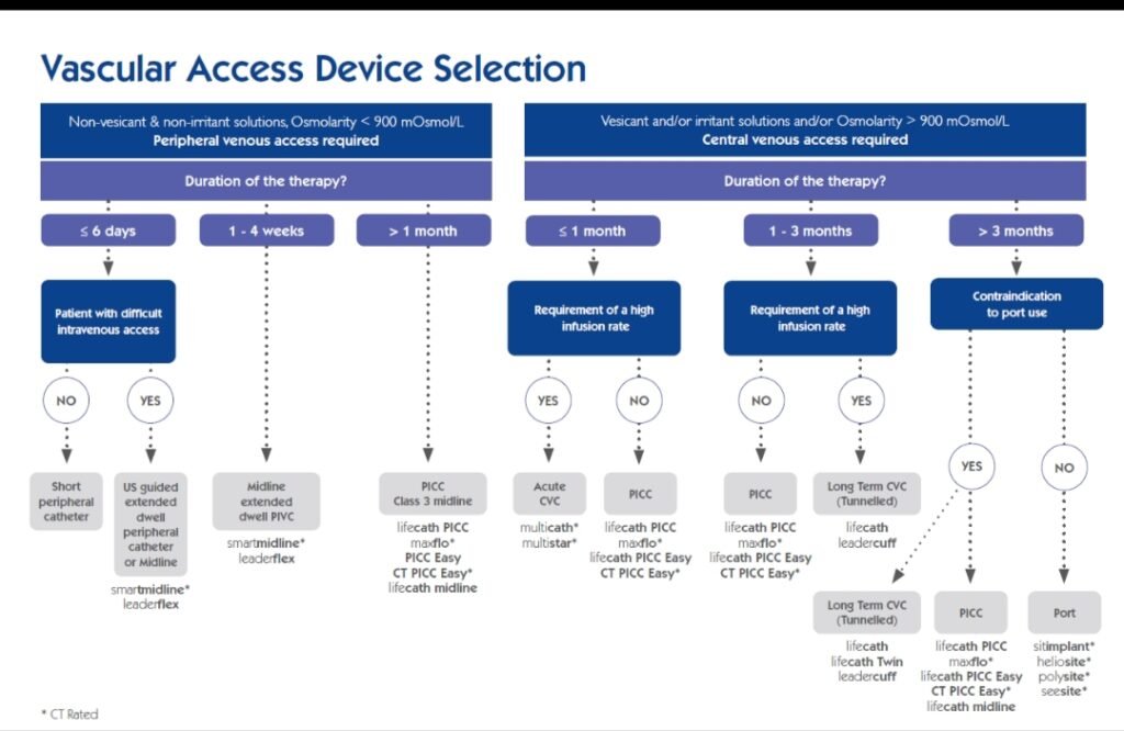 The flowchart uses step-by-step clinical questions related to:Expected duration of IV therapyType of medication (vesicant, irritant, osmolarity)Patient vein conditionFrequency of IV accessBased on answers, the most suitable vascular access device is recommended.