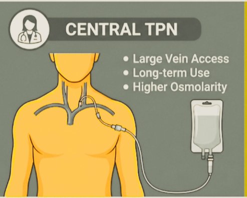 Total Parenteral Nutrition is a specialized IV infusion used when the digestive system is non-functioning or when the patient cannot meet nutritional needs orally or enterally.TPN bypasses the GI tract completely and provides:Dextrose (energy)Amino acids (protein)Lipids (fat)ElectrolytesVitaminsTrace elementsFluidsBut route of administration decides how much nutrition the patient can safely receive. That route may be either central or peripheral.